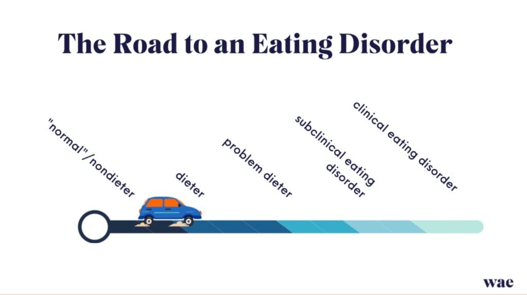 Disordered eating sits on one end of the spectrum; clinical eating disorders on the other. But the line between them isn’t always fixed, and one can develop into the other over time like the visual below:
